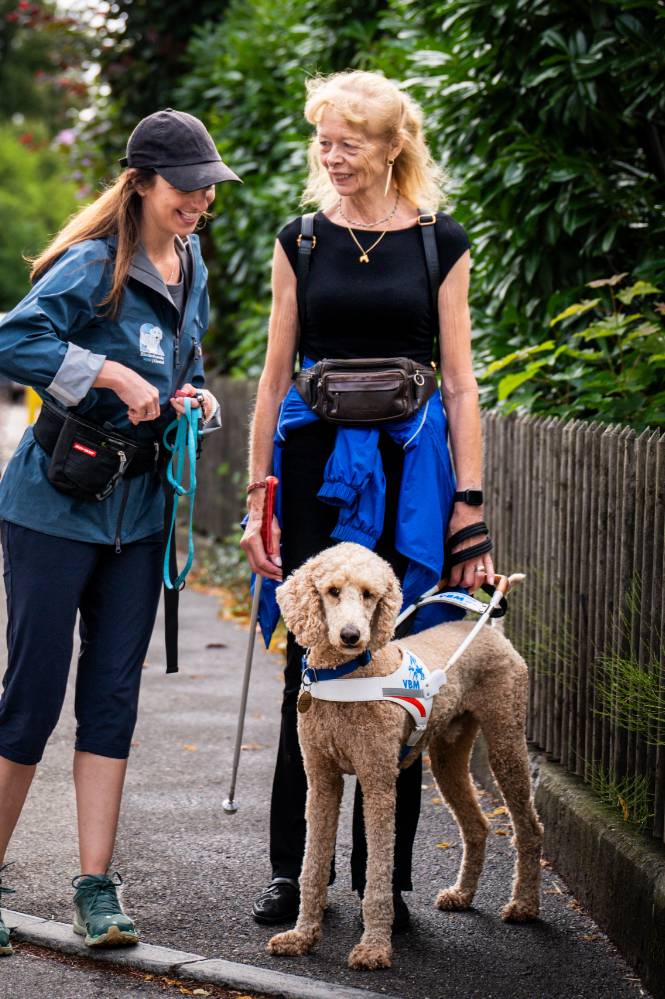 Führhundehalterin mit Blindenführhundetrainerin i.A.