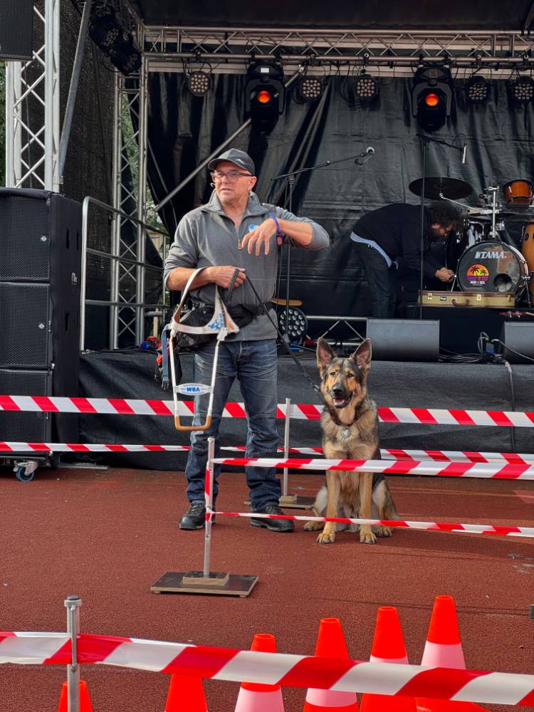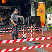 Tim mit Schäferhund Ulany bei der Vorführung vor der Festivalbühne