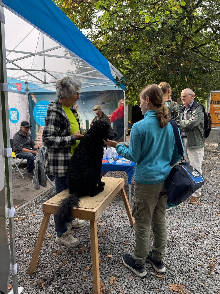 Besuchende am Stand stellen Fragen und streicheln auch mal eine Hund.