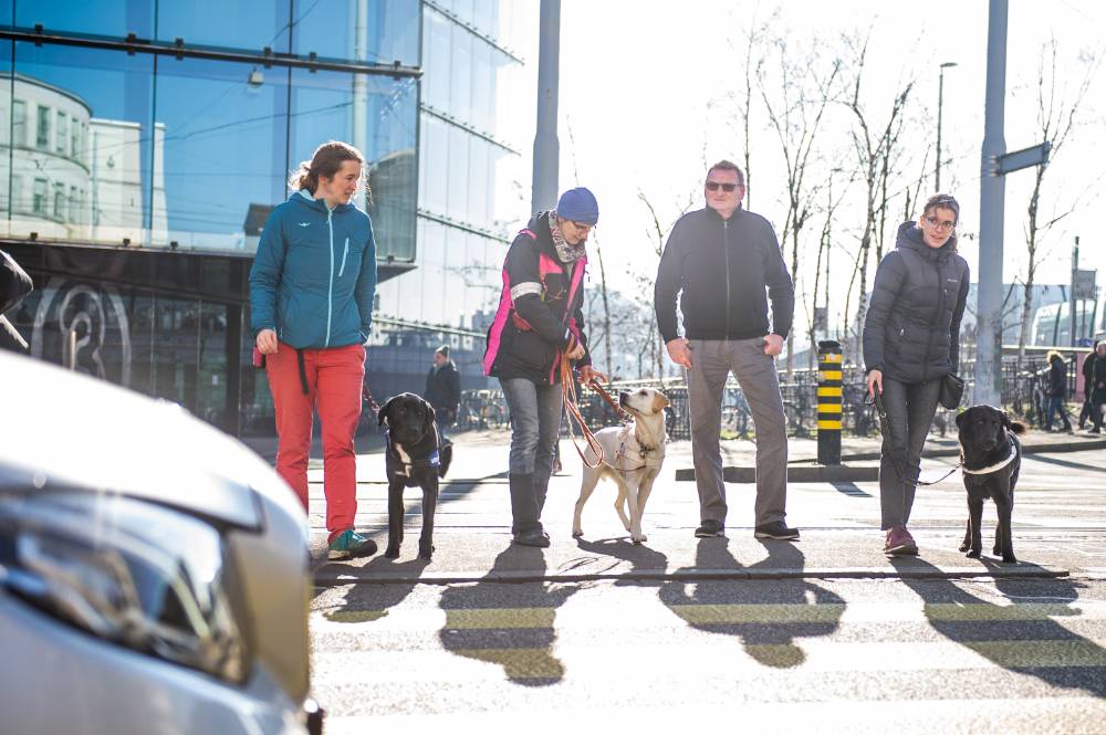 Vertrauenshundeteams unterwegs in der Stadt an Fussgängerstreifen